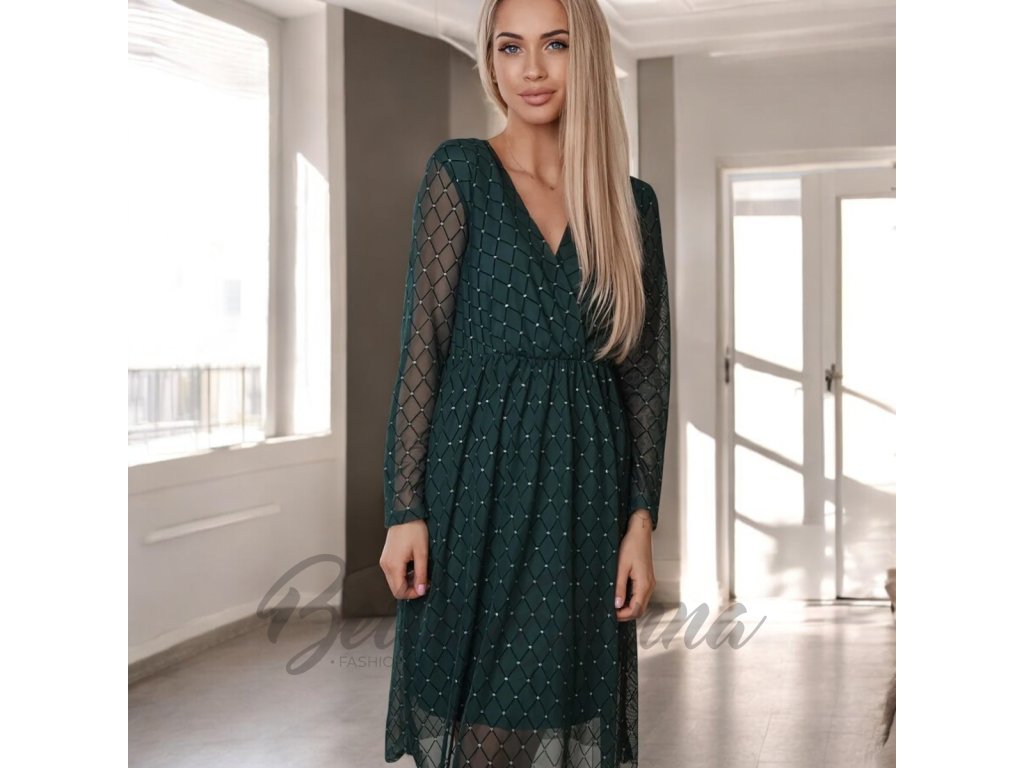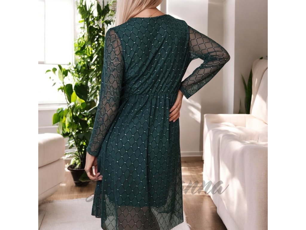 Elegantné šaty s priehľadnými rukávmi – vyrobené z látky zdobenej jemnými kryštálmi, s výstrihom do V a elastickým pásom, ktorý zvýrazní vašu postavu. Dokonalá voľba na večerné príležitosti či špeciálne udalosti.