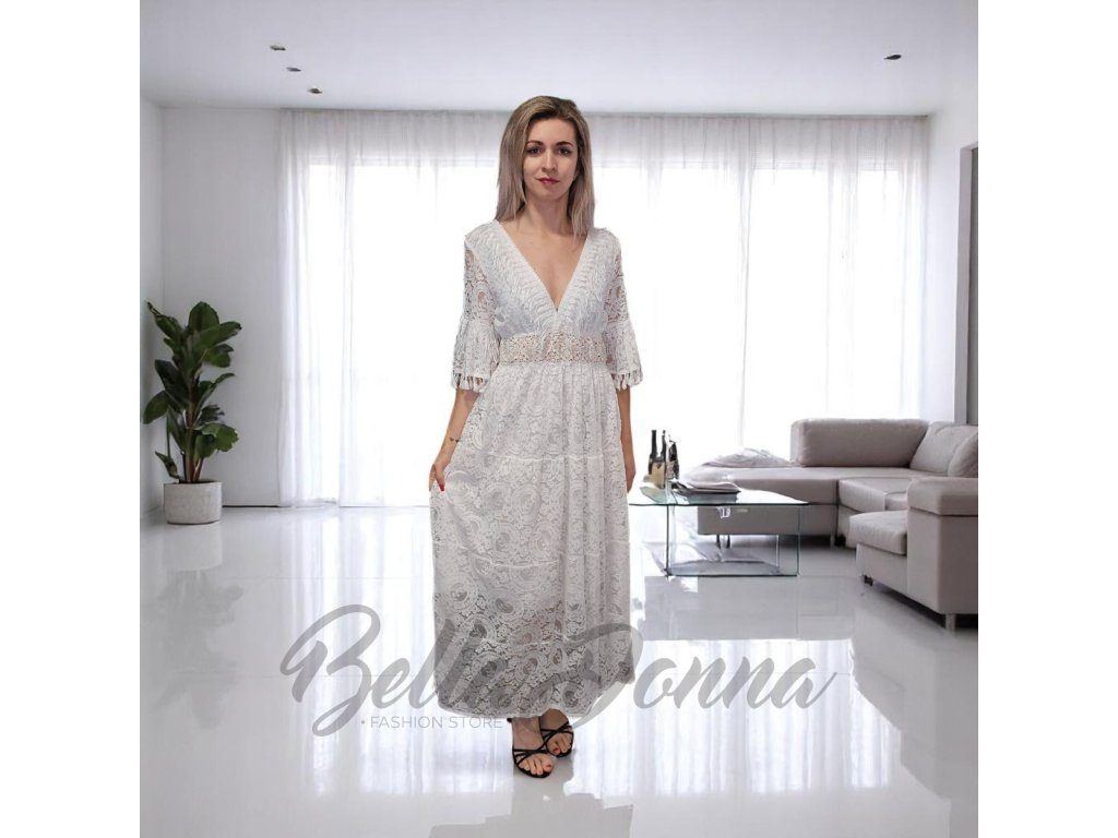Romantické dlhé šaty v boho štýle, ktoré pôsobia ľahko a vzdušne. Pod prsiami majú krásny detail z priesvitnej čipky, ktorý dodáva jemný a ženský vzhľad. Perfektné na letné oslavy, festivaly či dovolenkové večery.