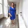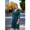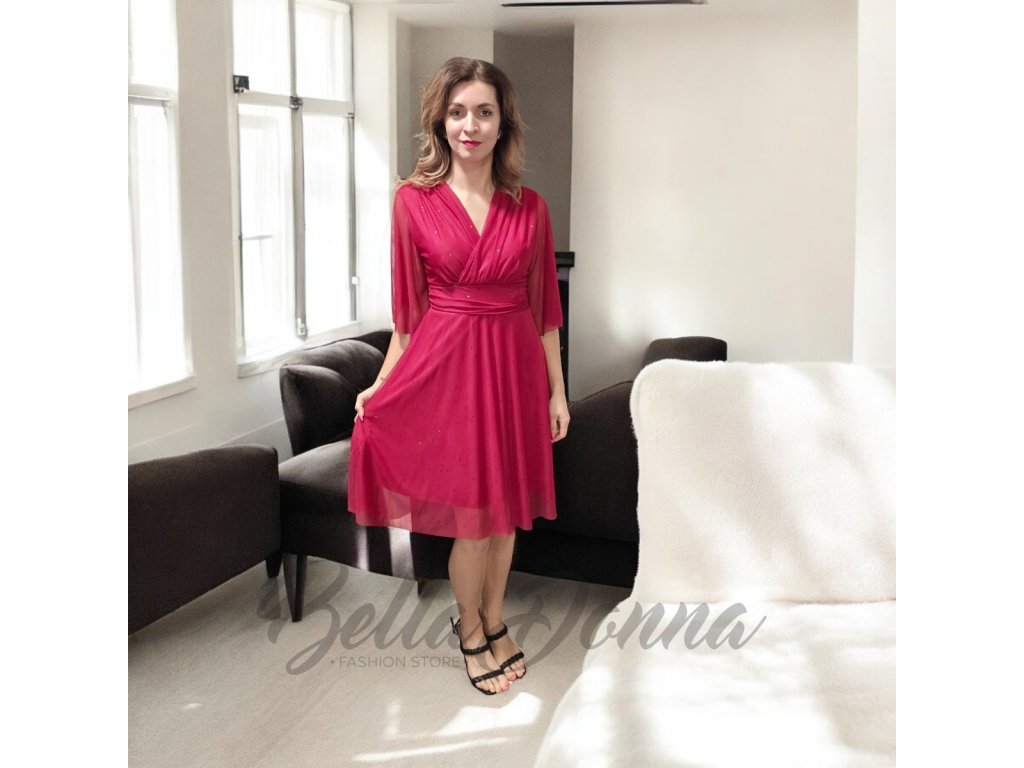 Elegantné krátke spoločenské šaty s krásnym výstrihom do V. Celé šaty sú potiahnuté jemným tylom s trblietavým efektom, vďaka čomu pôsobia slávnostne, no stále veľmi jemne.