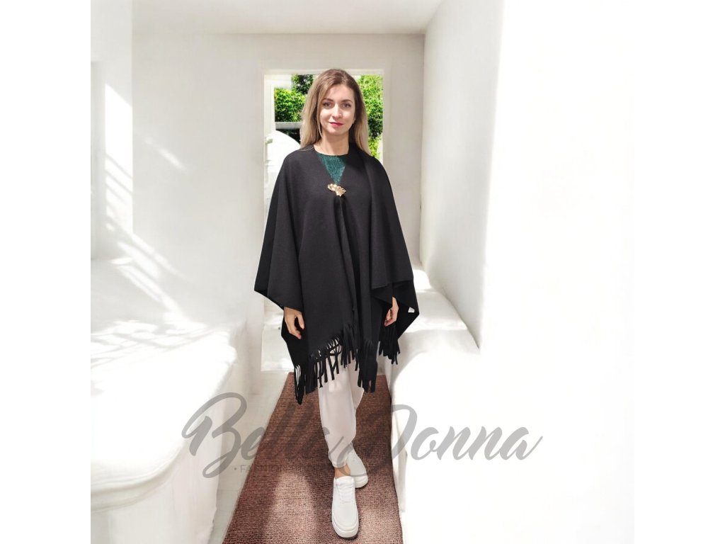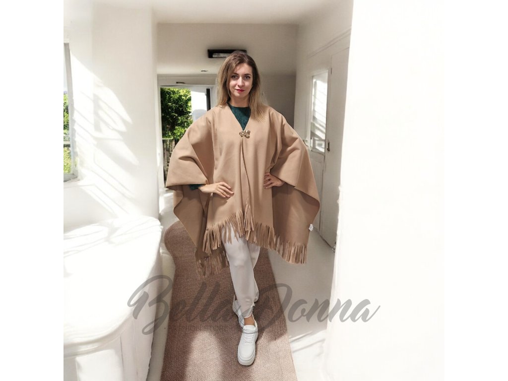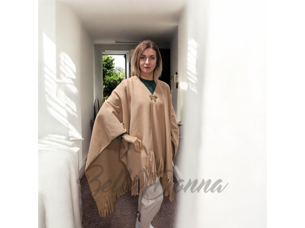 Toto štýlové pončo s praktickým zapínaním na ozdobnú sponu a decentnými strapcami na spodku je ideálne na prechodné obdobie aj chladnejšie dni. Jeho voľný strih krásne padne každej postave a vďaka univerzálnemu dizajnu je vhodné aj pre moletky.