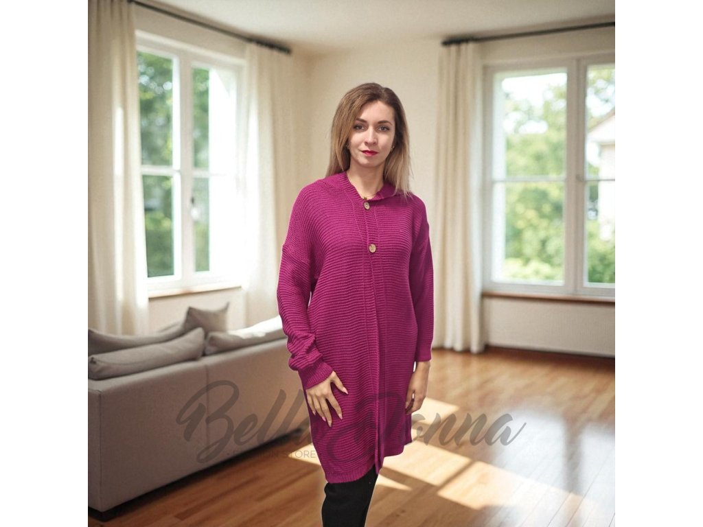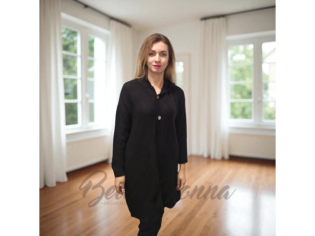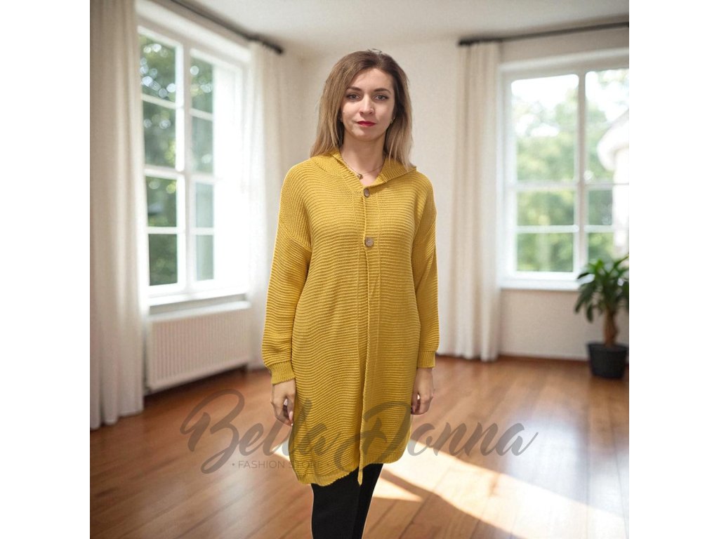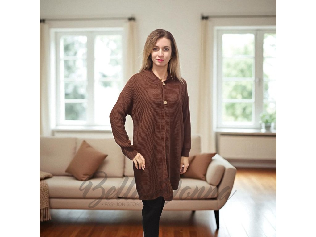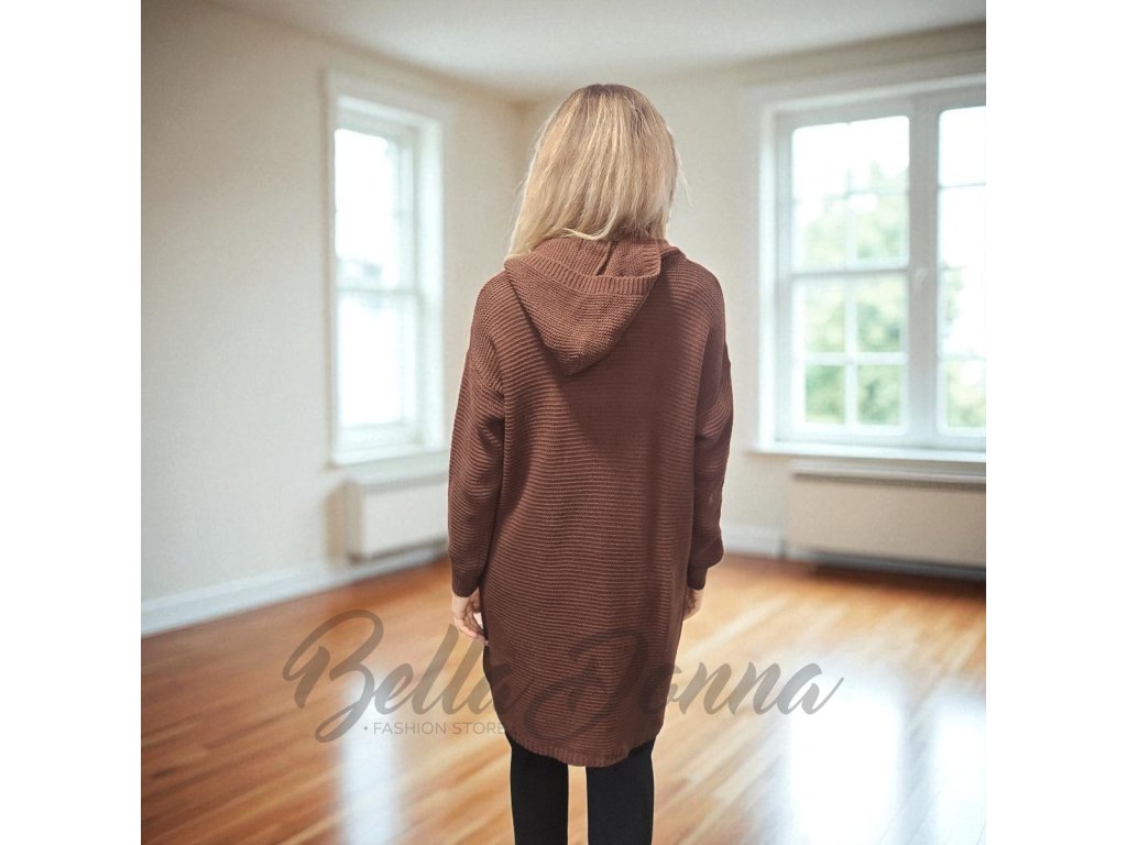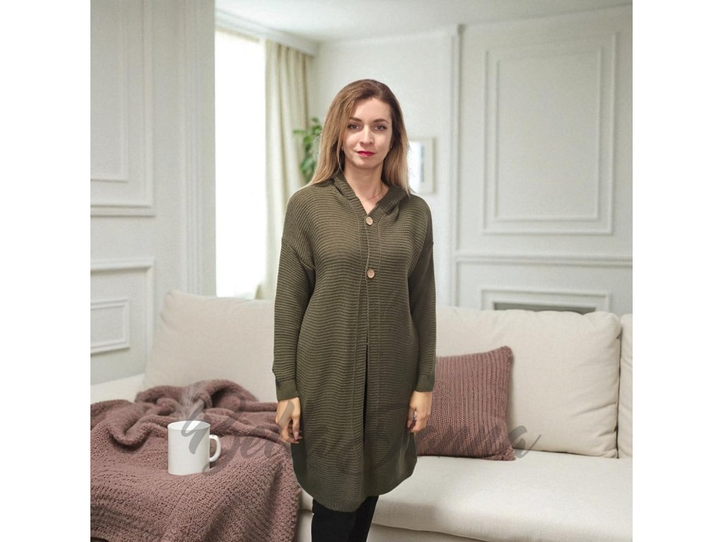 Predĺžený sveter s kapucňou a dvomi gombíkmi je dokonalým spojením pohodlia a elegancie. Vďaka voľnému strihu skvelo sedí a lichotí postave, ideálny na vrstvenie počas chladnejších dní.