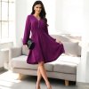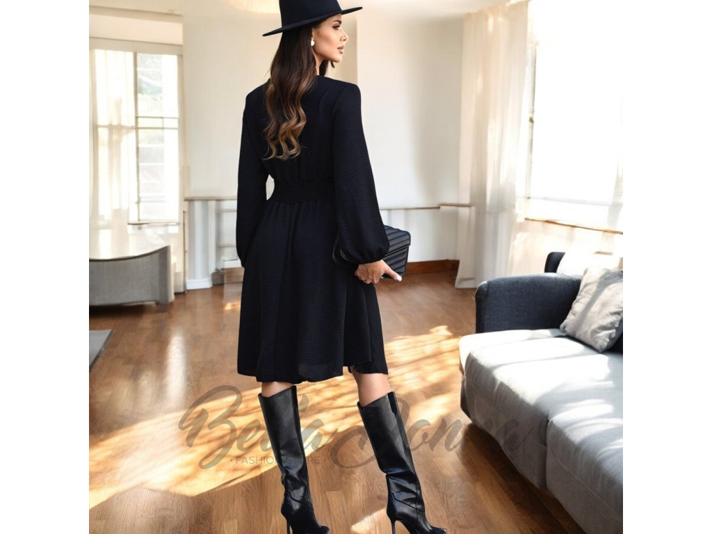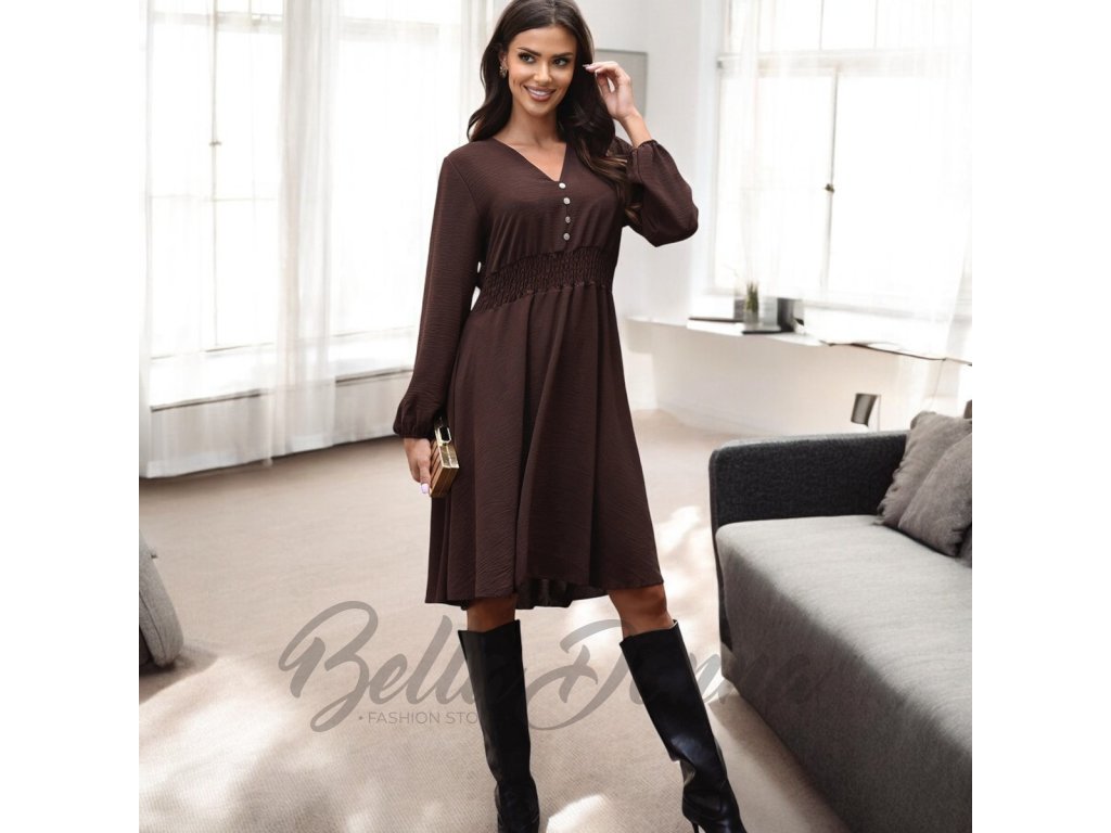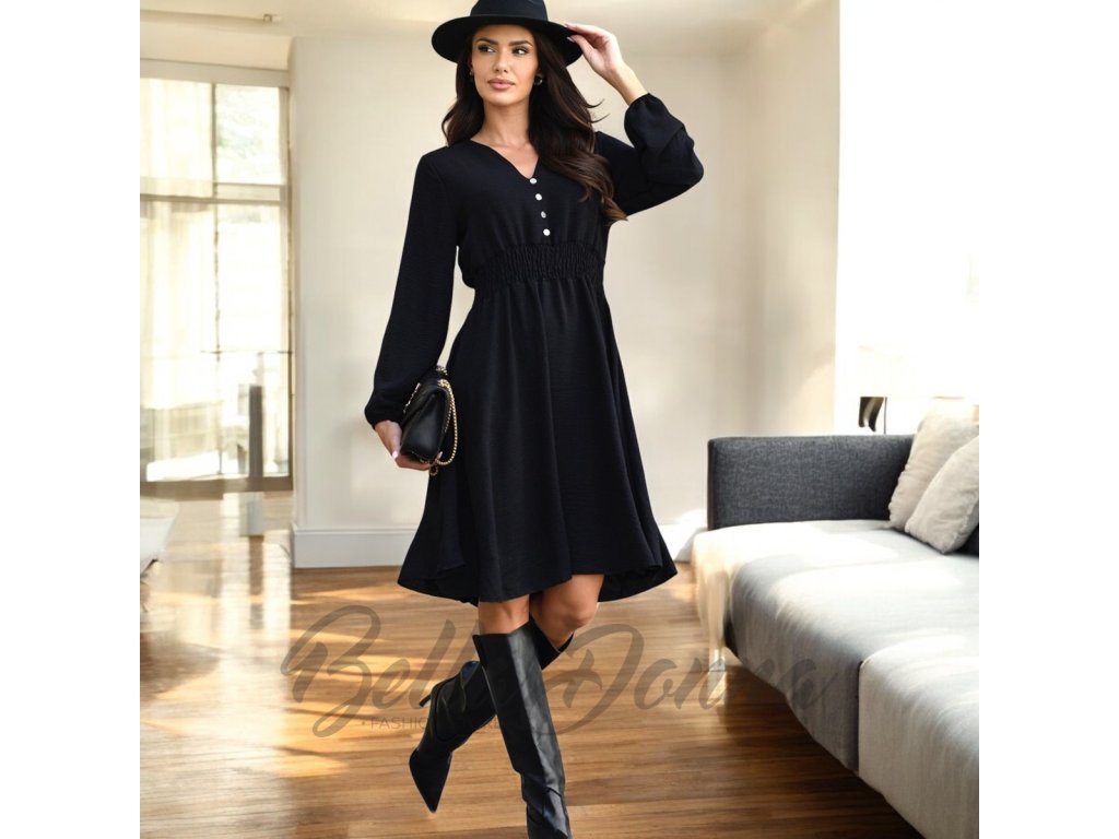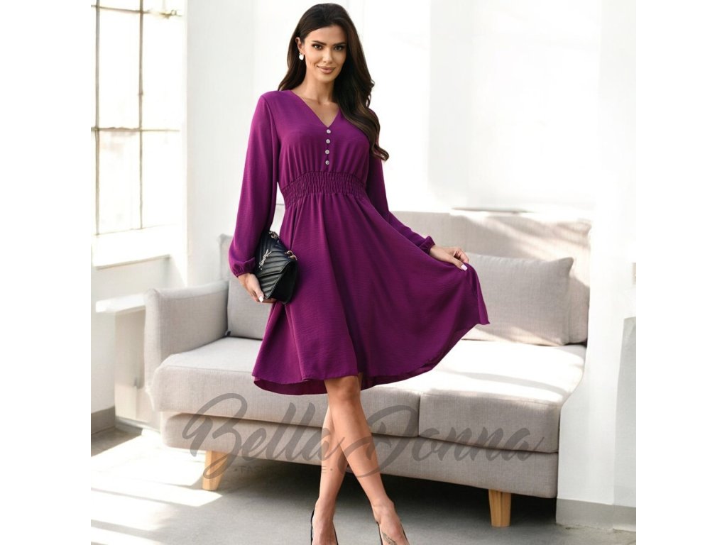 Splývavé šaty po kolená s dlhými rukávmi pôsobia elegantne a žensky. Výstrih do V zdobený drobnými gombíkmi dodáva modelu jemný romantický nádych. Ideálne na bežné nosenie aj spoločenské príležitosti.