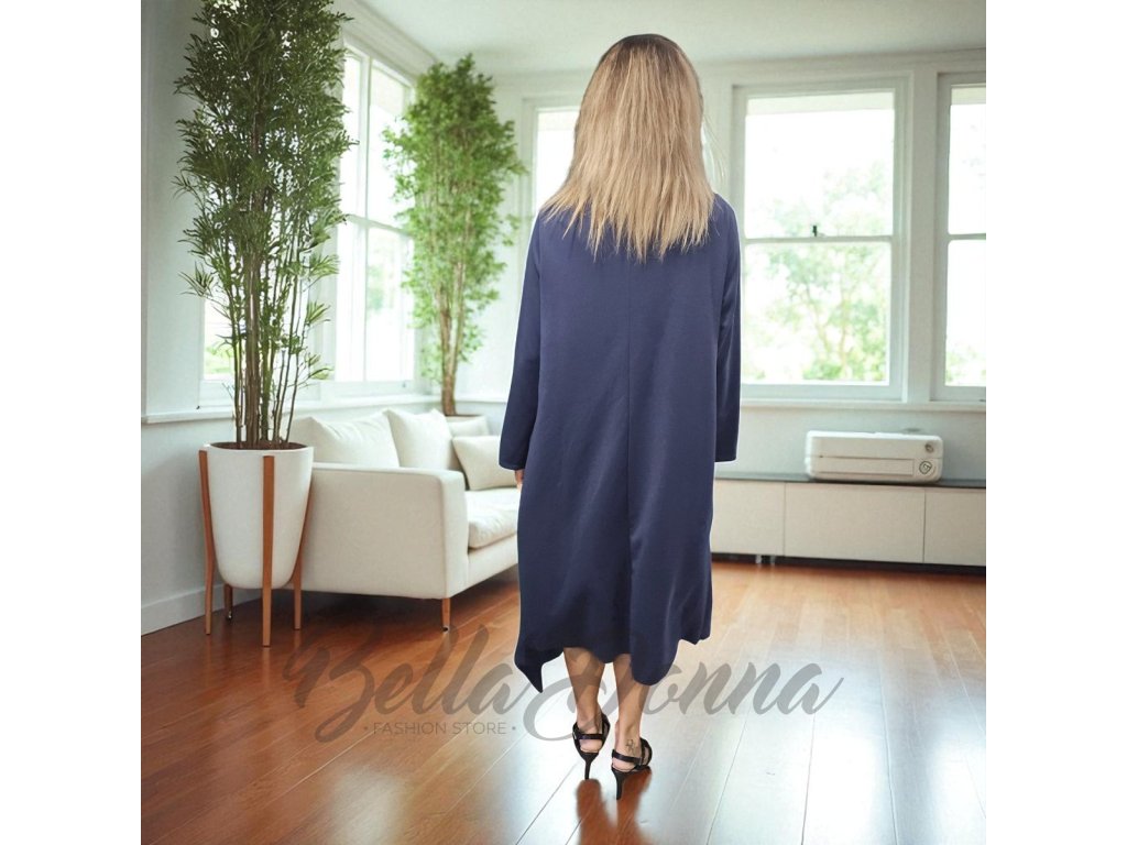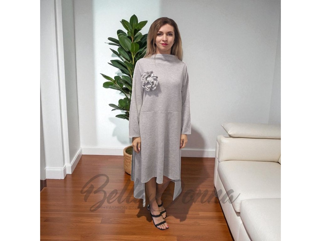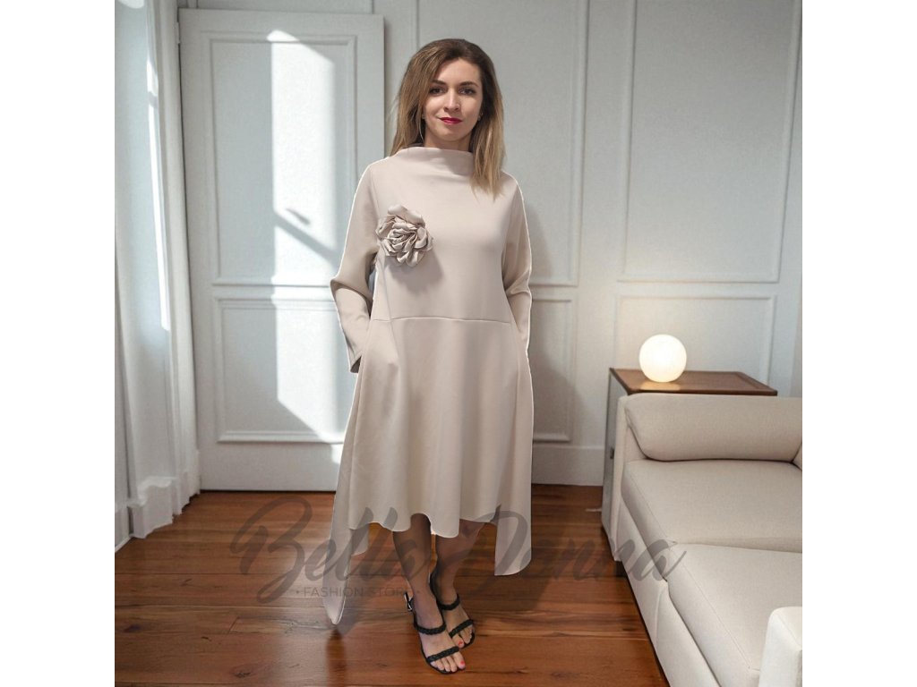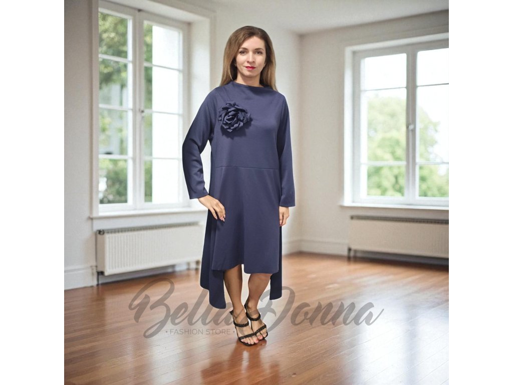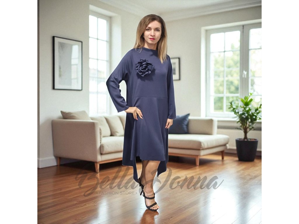 Elegantná tunika alebo šaty vo voľnejšom strihu, ideálne pre moletky. Ozdobené krásnou textilnou ružou, ktorú je možné jednoducho odopnúť. Po bokoch sú dlhšie, čo vytvára lichotivý efekt a dodáva modelu šmrnc.
