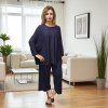Elegantný a pohodlný set, ktorý sadne každej postave. Voľný top s prsiami do 180–200 cm (dĺžka 73–77 cm) v kombinácii s nohavicami s pásom do 80–130 cm (dĺžka 100 cm) zaručí komfort a štýlový vzhľad.