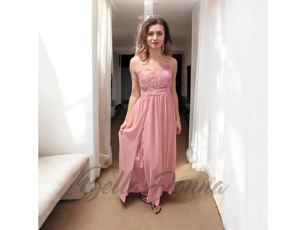 Nádherné spoločenské šaty s čipkou na ramienkach sú výnimočným kúskom, ktorý očarí na prvý pohľad. Jemná čipka s drobnými kvetinovými motívmi pôsobí veľmi žensky a romanticky, zatiaľ čo splývavý strih dodáva šatám eleganciu a ľahkosť. Ramienka z čipky krásne dotvárajú celkový vzhľad a pôsobia jemne a vkusne.