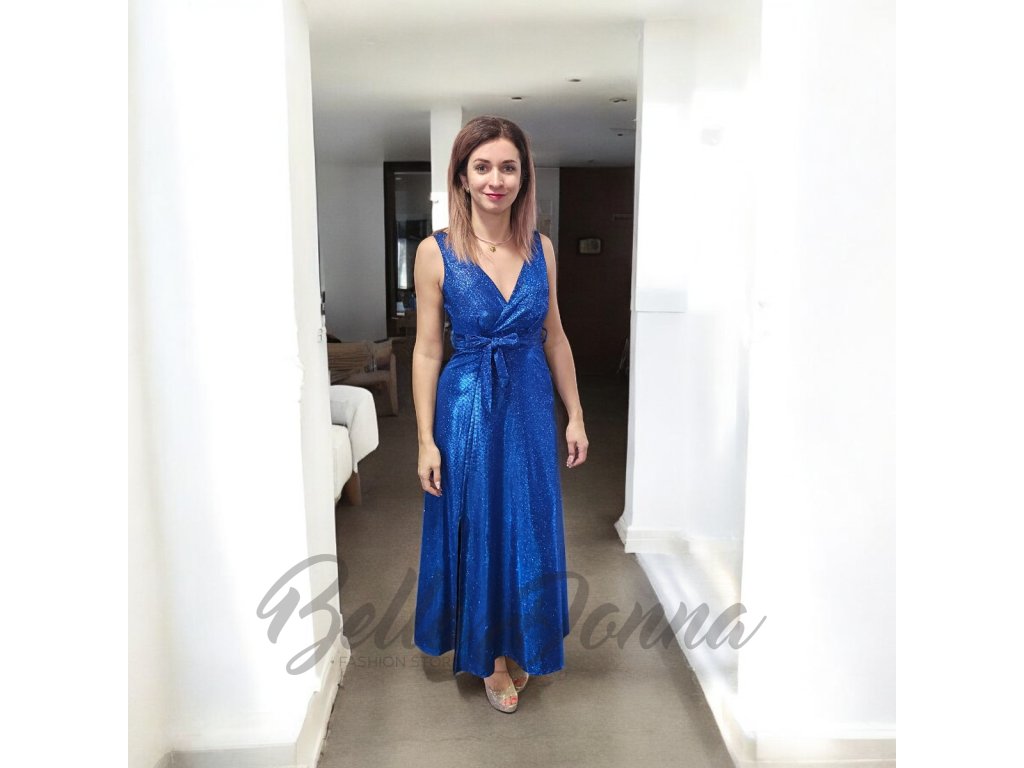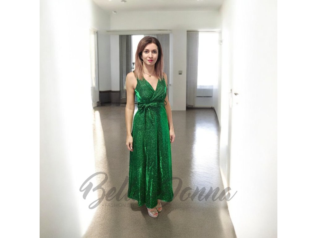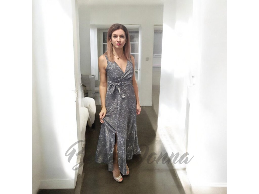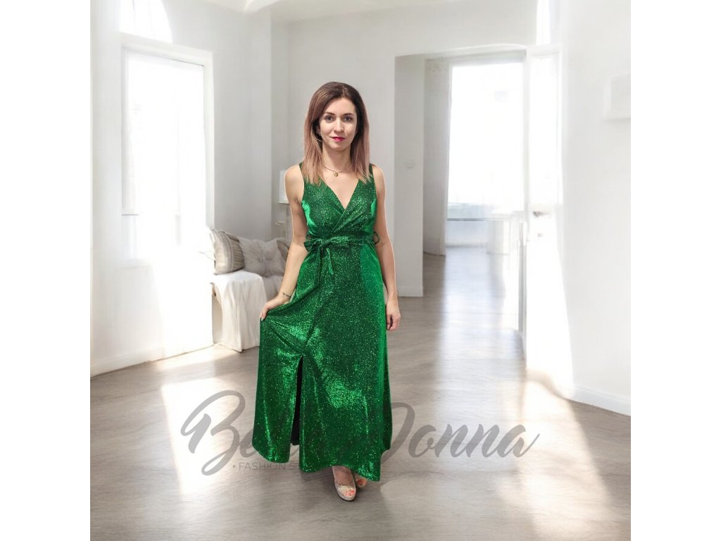 Elegantné dlhé trblietavé spoločenské šaty s rozparkom a ozdobným opaskom sú ideálnou voľbou na plesy, svadby či večerné oslavy. Vzadu sa zapínajú na zips, vďaka čomu krásne sedia na postave a zvýraznia ženské krivky. Lesklý materiál dodáva šatám luxusný vzhľad, zatiaľ čo jemný strih s rozparkom umožňuje pohodlný pohyb. Dostupné vo veľkosti prsia 80–100 cm, dĺžka 140 cm.