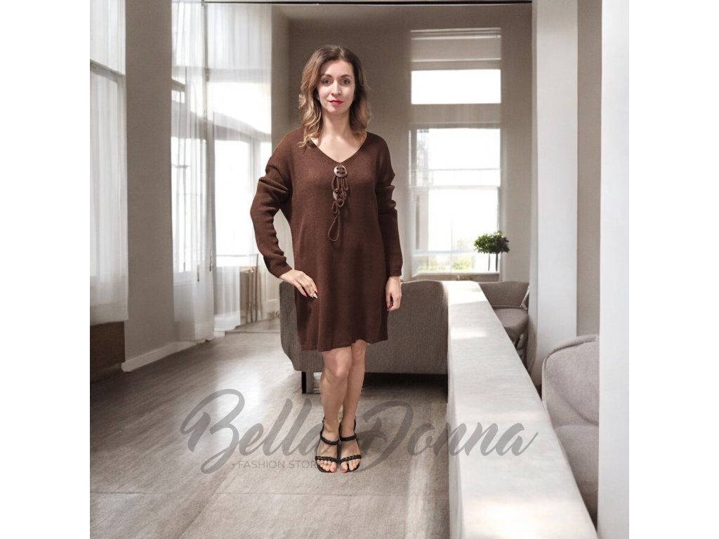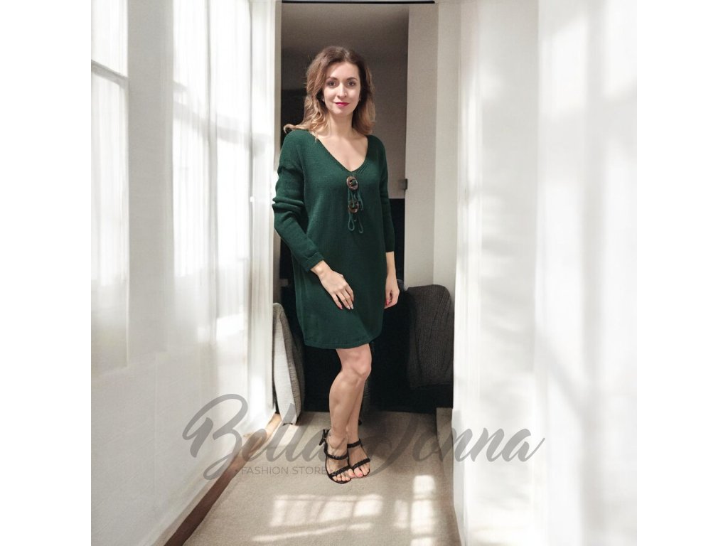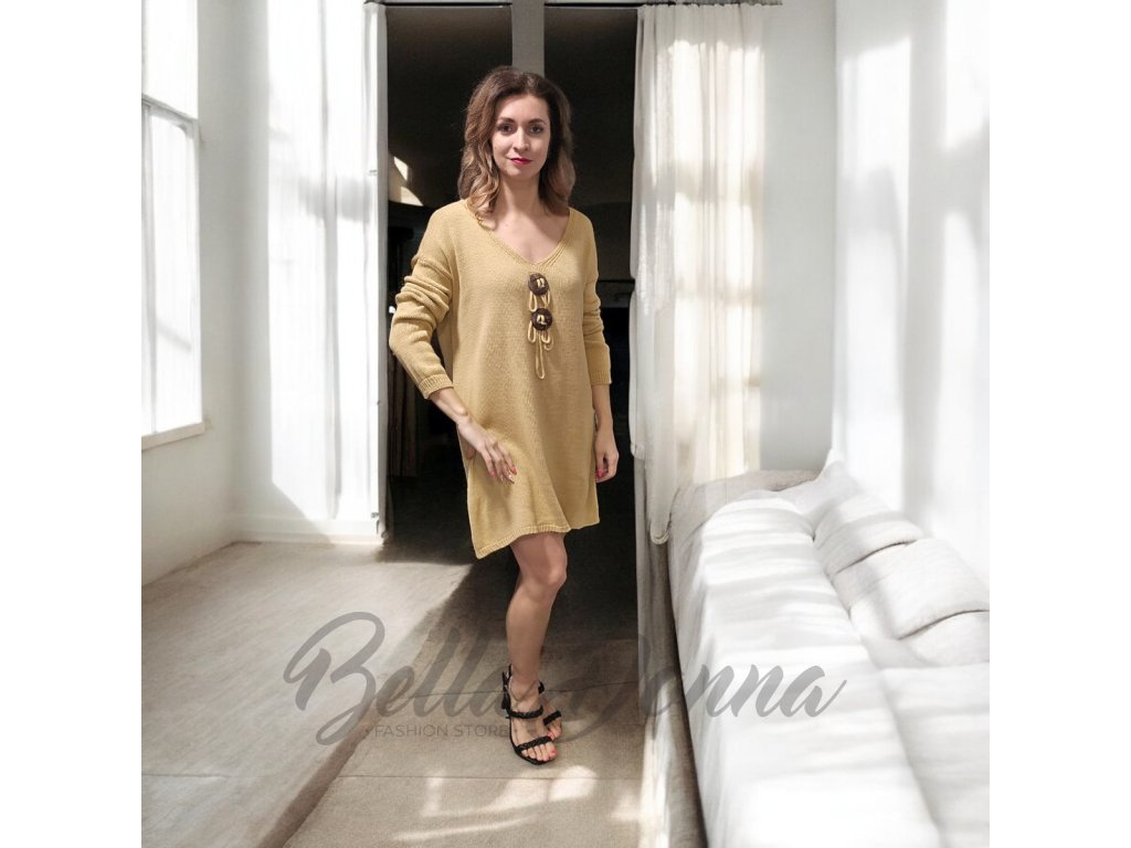 Úpletové šaty alebo tunika, ktoré zaujmú originálnou aplikáciou na hrudi, doplnenou ozdobnými gombíkmi. Príjemný pružný materiál, ktorý sa krásne prispôsobí postave, vhodné na legíny, pančuchy či slim nohavice.