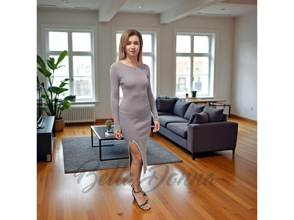 Dlhé úpletové šaty s rozparkom, olemované jemnými striebornými trblietkami, ktoré im dodávajú efektný a elegantný vzhľad. Pruhovaný vzor krásne predĺži postavu a elastický materiál sa prispôsobí vašej siluete. Ideálne na letné dni, večerné posedenia či špeciálne príležitosti.