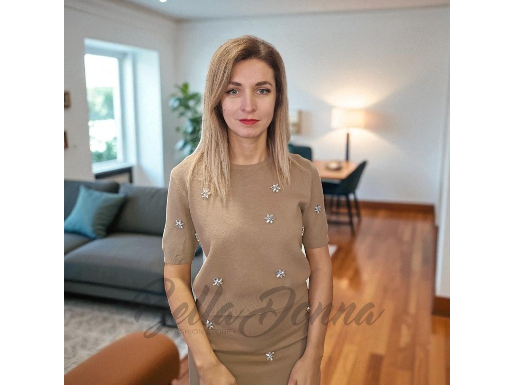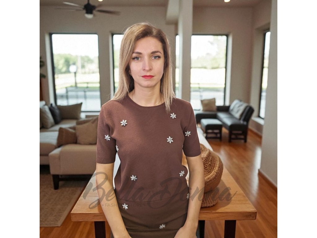 Úpletový top s kvetinovou aplikáciou – jemný, ženský a ľahko kombinovateľný.
