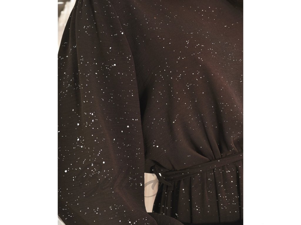 Tieto splývavé šaty s dlhým rukávom sú ušité z nádherne trblietavej látky, vďaka čomu sú ideálne na večerné nosenie. Okrúhly výstrih a zaväzovanie v páse krásne zvýraznia siluetu a dodajú outfitu elegantný vzhľad.
