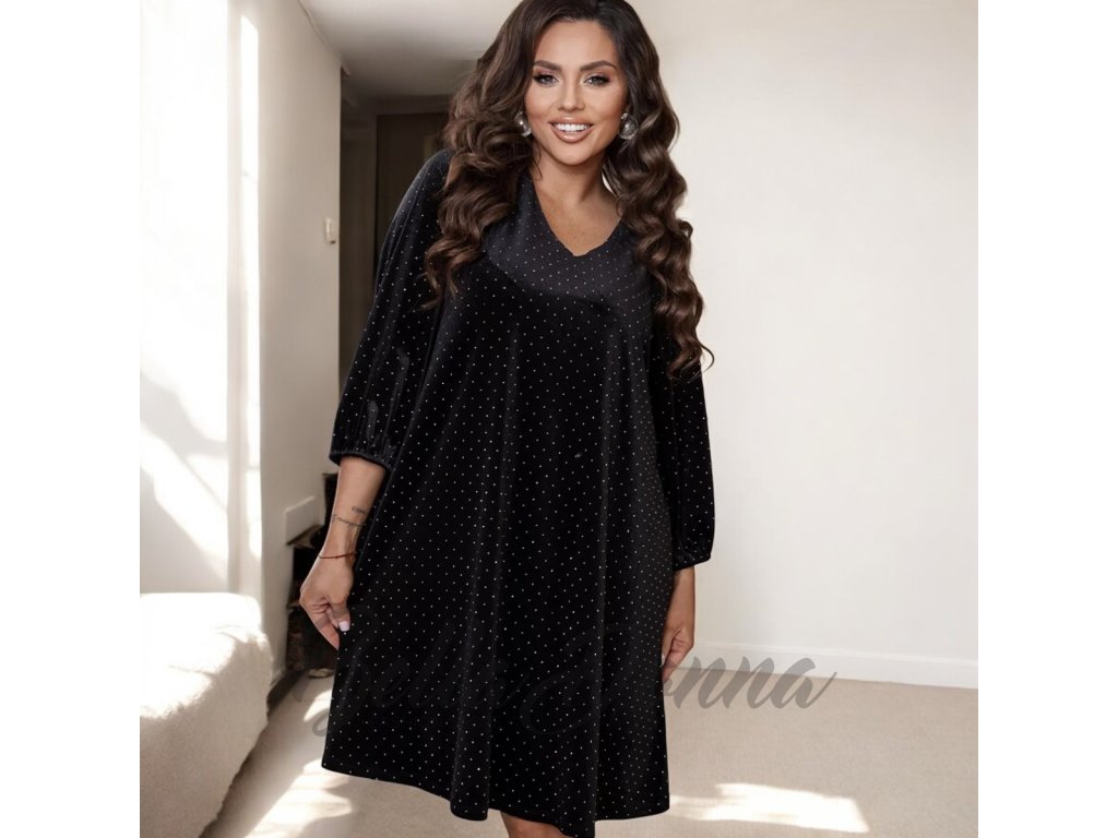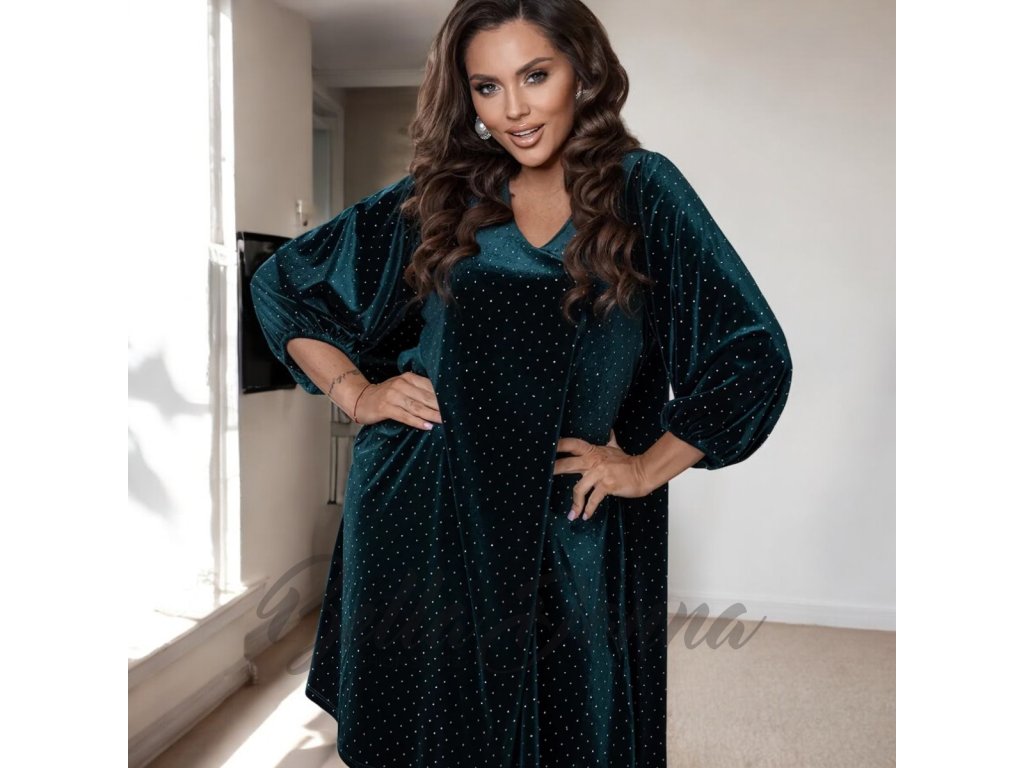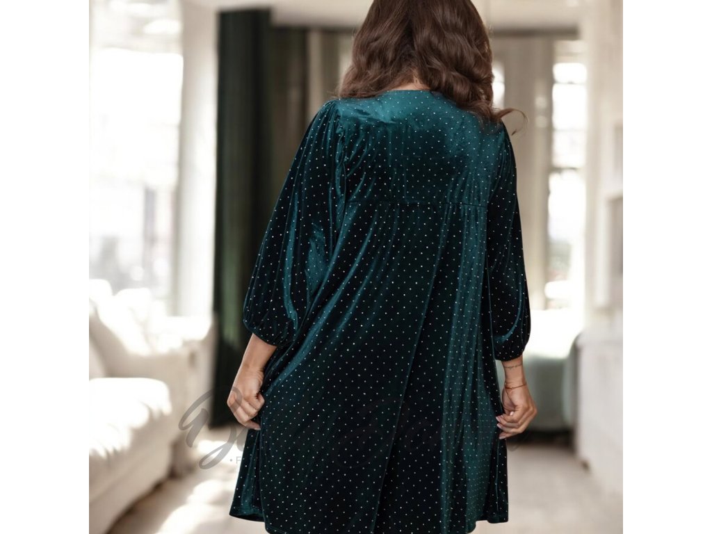 Trblietavé šaty z ľahkého zamatu majú pohodlný voľnejší strih a 3/4 rukávy. Výstrih do V pôsobí žensky a praktické vrecká dodávajú modelu nenútenú eleganciu.